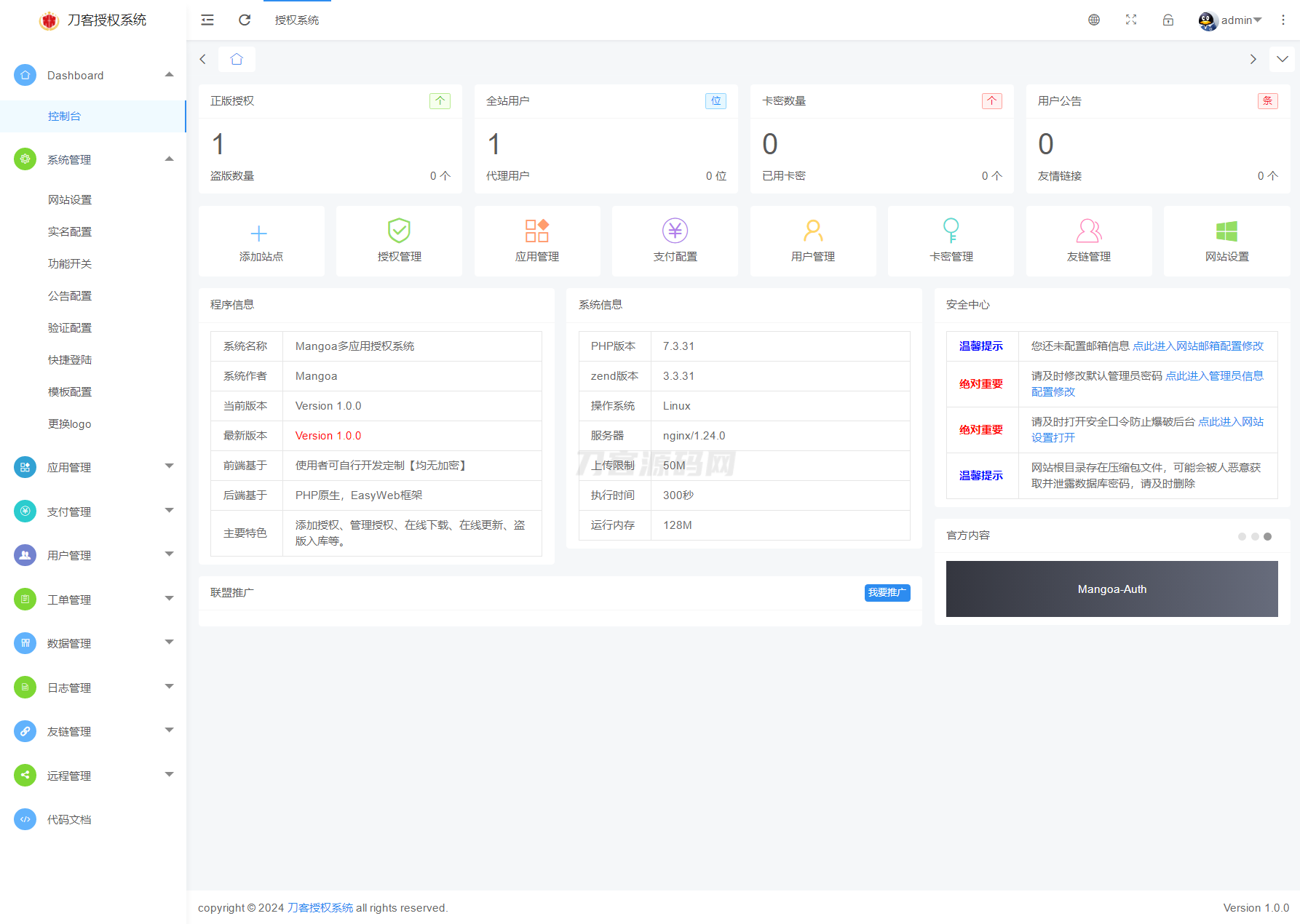 Mangoa_Auth多应用授权系统是专门为个人或企业开发者打造的一款自助多应用授权程序,后端基于PHP原生,前端基于EasyWeb框架,拥有域名授权、秘钥授权、IP授权,您可以根据您喜欢的方式进行授权验证,其中您还可以关闭授权验证等您想开启的时候随时开启授权验证即可,并且我们集成了独立的用户中心系统,用户可以自助进行注册并且购买授权,当然,也可以自助更换授权、自助下载源码、自助升级权限等,完全不用人工操作。