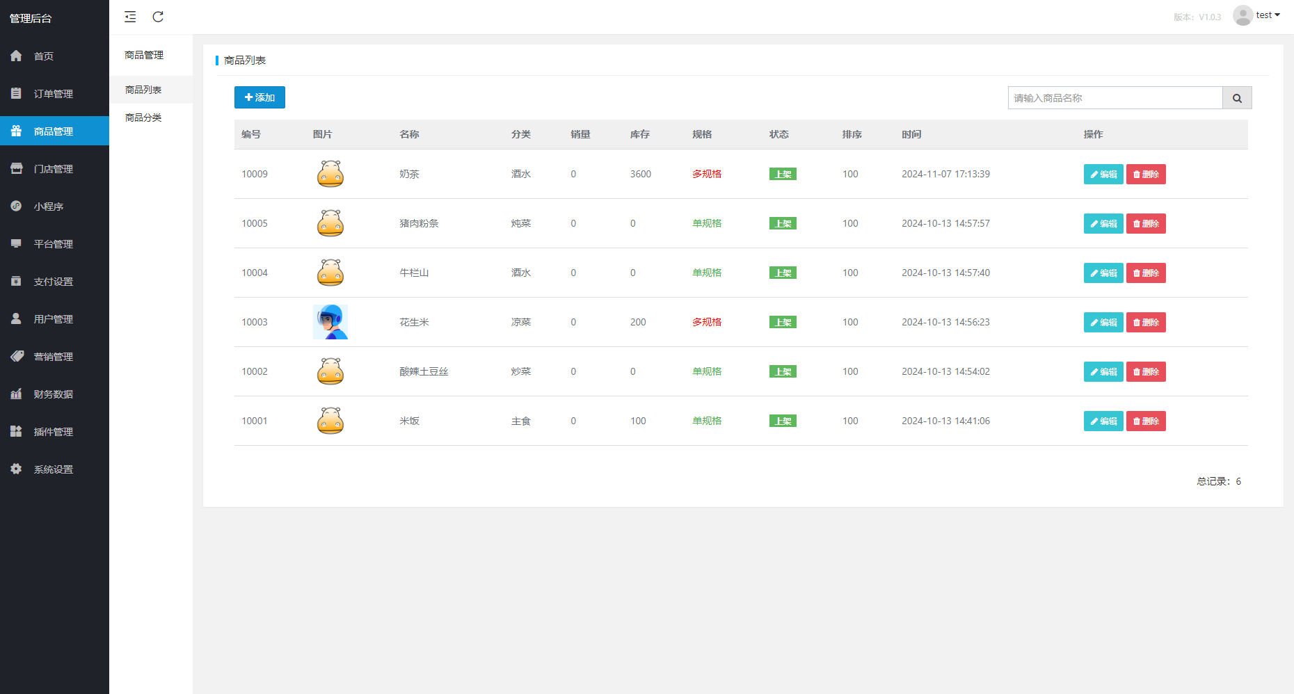 7.商品管理:单,多规格,起售数量,打包费,库存销量推荐等操作。