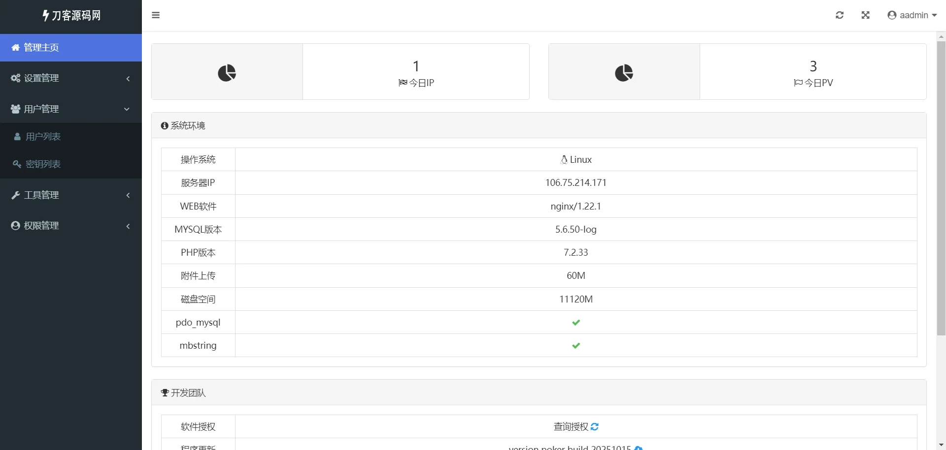 后台功能:ip访问统计、sql命令工具、升级模块、管理员模块、会员模块、卡密模块